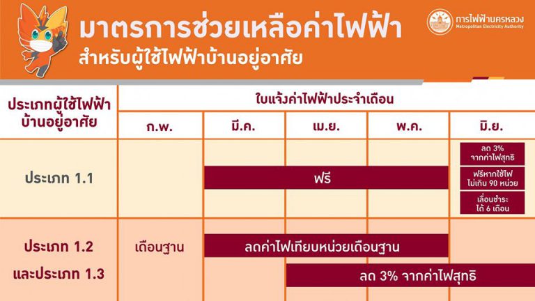 MEA สรุปมาตรการช่วยเหลือผู้ใช้ไฟฟ้าประเภทบ้านอยู่อาศัย ในช่วงวิกฤต COVID-19 ตามมติคณะรัฐมนตรี ดังนี้